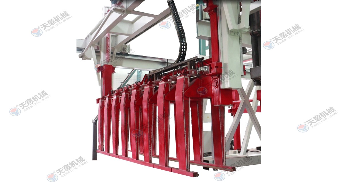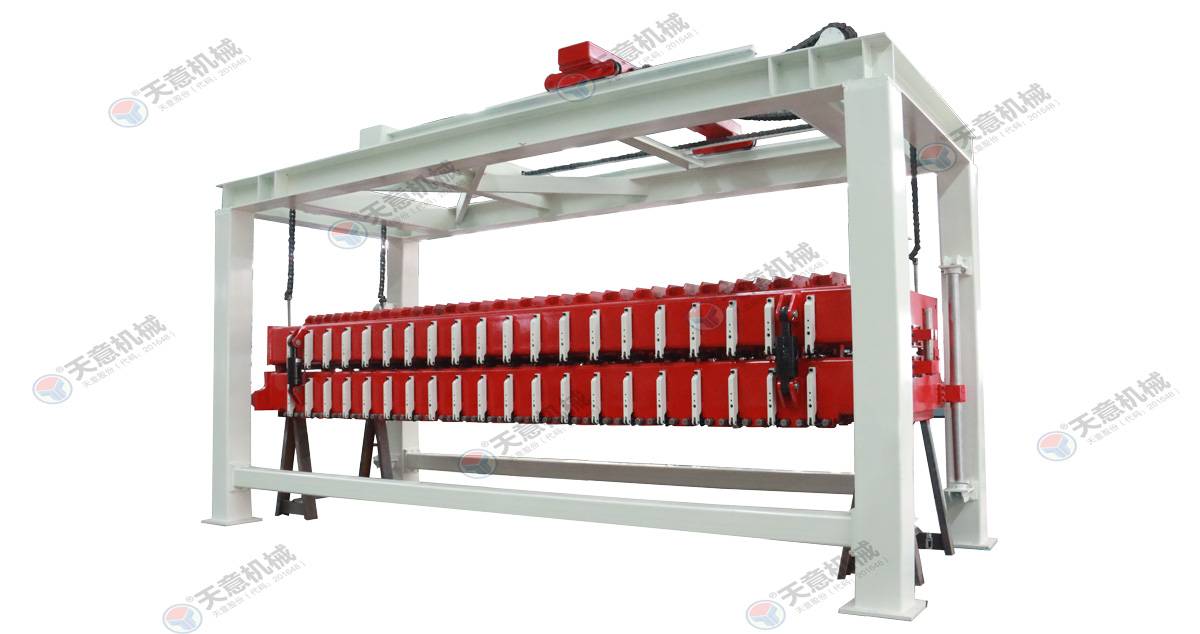 成品分垛吊機(jī):將蒸養(yǎng)車上的一模坯體吊運(yùn)至掰板輸送機(jī)上,然后將空側(cè)板吊運(yùn)至蒸養(yǎng)車上;切割工段空翻脫模機(jī)將模框翻轉(zhuǎn)90°,放在切割小車支座上進(jìn)行脫模,脫模后的模框與清理后的側(cè)模板進(jìn)行合模,合膜后的空模框被吊...