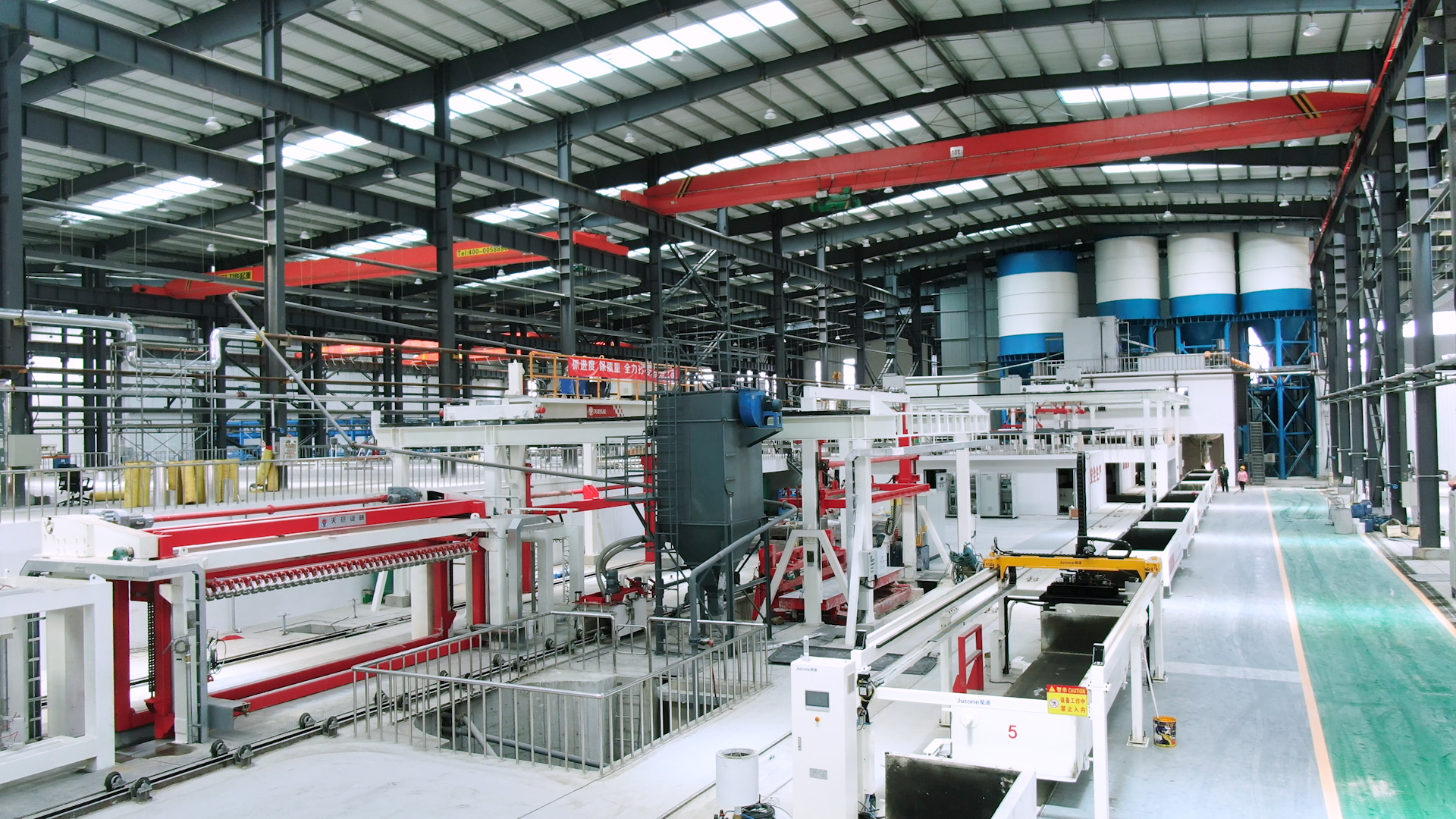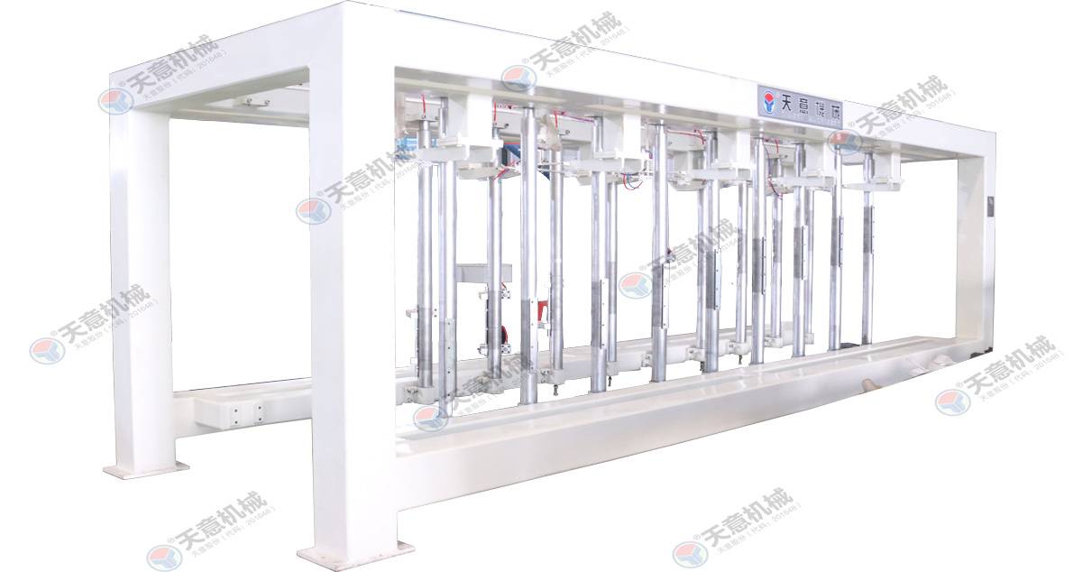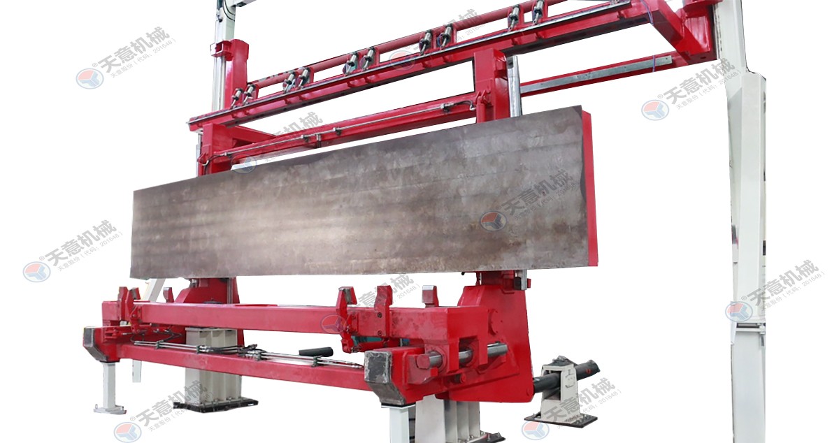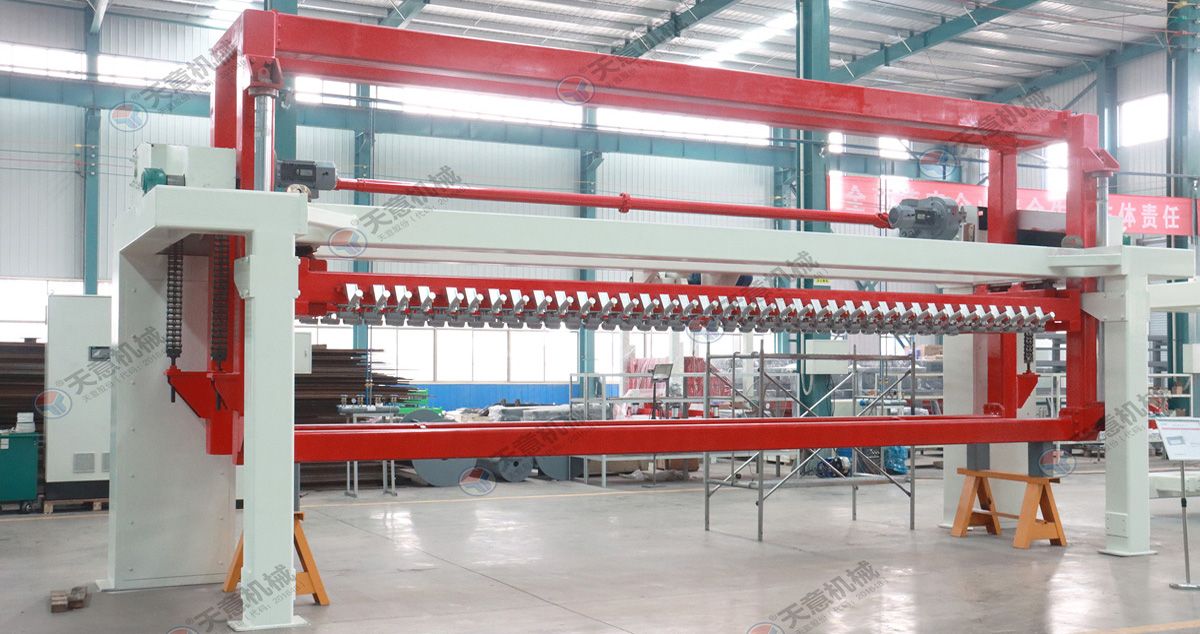 翻轉(zhuǎn)吊機(jī):抓取模箱翻轉(zhuǎn)90°,側(cè)立在切割小車上進(jìn)行切割;切割工段空翻脫模機(jī)將??蚍D(zhuǎn)90°,放在切割小車支座上進(jìn)行脫模,脫模后的模框與清理后的側(cè)模板進(jìn)行合模,合膜后的空模框被吊運(yùn)至模具回程軌道上進(jìn)行涂油處...
